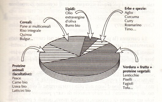 David Servan-Schreiber è uno scienziato francese attivo nel settore della psichiatria e delle neuroscienze: direttore di un laboratorio di ricerche a Pittsburgh. All'età di trentanni scoprì di avere un cancro al cervello. Dopo due operazioni chirurgiche e la relativa chemioterapia, David, scienziato di formazione occidentale, decide di guardare ad altre Medicine e ad esse si dedica con grande impegno personale di studio e di ricerca. Questa sua storia ed esperienza sono raccontate in modo appassionato nel libro Anti-Cancro (Sperling Kupfer) di cui consigliamo la lettura, e del quale in questa pagina del nostro sito sintetizziamo i capitoli dedicati alla "alimentazione anticancro". Questa alimentazione, come risulta dalla figura sottostante, è composta principalmente di verdure e legumi, ma non esclude un uso moderato di carne. Occorre invece operare una riduzione delle farine bianche, degli zuccheri e dei latticini.