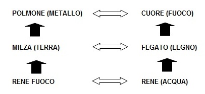 Le frecce nere indicano il rapporto madre-figlio nei polsi: a sinistra il Rene del movimento Acqua produce il Legno che a sua volta produce il Fuoco delle energie di Cuore, mentre a destra il Fuoco delle energie yang (espresse dal Rene) produce la Terra (Milza) che a sua volta produce il Metallo (Polmone).