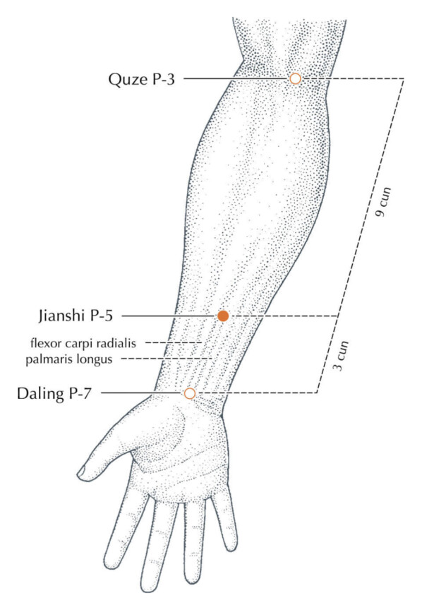 L'azione chiave di Jiānshi PC-5 è trasformare il flemma nel jiao superiore e prevalentemente nel Cuore. Insieme a Fenglóng ST-40 è uno dei due principali punti di agopuntura per trattare i disturbi del catarro. La flemma che ostruisce il Cuore può insorgere in uno dei seguenti modi: 1. l'eccesso di una qualsiasi delle sette emozioni provoca il ristagno di qi che ostacola la regolare circolazione dei fluidi corporei e, trasformandosi in fuoco, condensa ulteriormente i fluidi corporei stagnanti per formare catarro; 2. il ristagno del qi del Fegato compromette la funzione della Milza di trasformare e trasportare i fluidi che formano il catarro e salgono con il qi stagnante per disturbare il Cuore; 3. la febbre alta condensa i fluidi corporei in catarro, nel qual caso la convenzione della medicina cinese attribuisce il disturbo al Pericardio; 4. la paura genera catarro, un concetto esposto da Gong Ju-zhong in Una macchia di neve su una stufa rovente "Il flemma è prodotto dalla paura. Lo spirito lascia la sua residenza, e quando la residenza è vuota, i fluidi formeranno catarro".